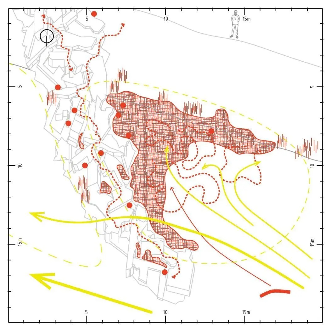 The aim is to create equality through the alienation of all three types of visitors (animal, citizen, outcast), while providing them with a uniform feeling of comfort and discomfort, and allowing them free passage and coexistence. Permeability for all, however also the neutralization of this battle between nature and people in vagueness and lack of clarity. Vagueness could be manifested by an alien amplified terrain vague that belongs to nobody. Rope and Mesh as a semipermeable, transparent barrier.